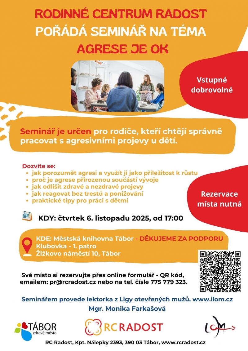 Registrace nutná: přes online formulář RC Radost - Rezervace místa na semináři  , e-mailem na pr@rcradost.cz nebo telefonicky na 775 779 323